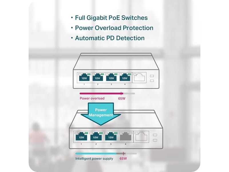 • do 65 W mocy PoE łącznie