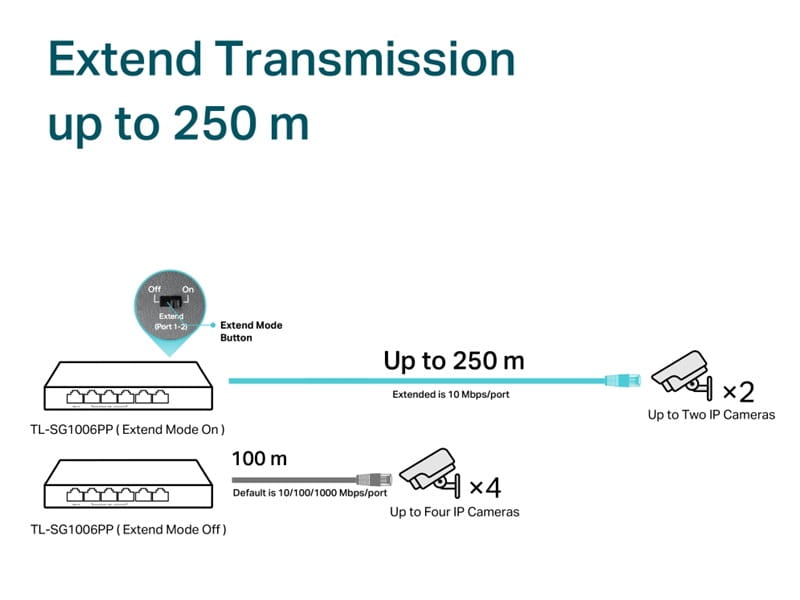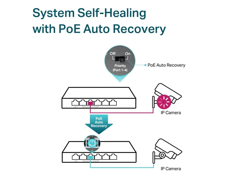 Switch, zewnętrzny zasilacz, maks. 60W / port PoE++, maks. 30W / port PoE+, maks. 64W dla portów PoE++/PoE+, tryb Extend, tryb PoE Auto Recovery
